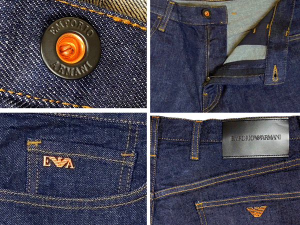 【仕様】ジッパーフライ、右コインポケットにEAイーグルプレート付き、正面ボタンにロゴ入り、背面右ポケットにGAイーグルプレート付き、右腰レザー調パッチに型押しロゴ入り、チュニジア製、※多少よれやしわや色斑や薄汚れや小さい糸ツレ等ある場合がございます。